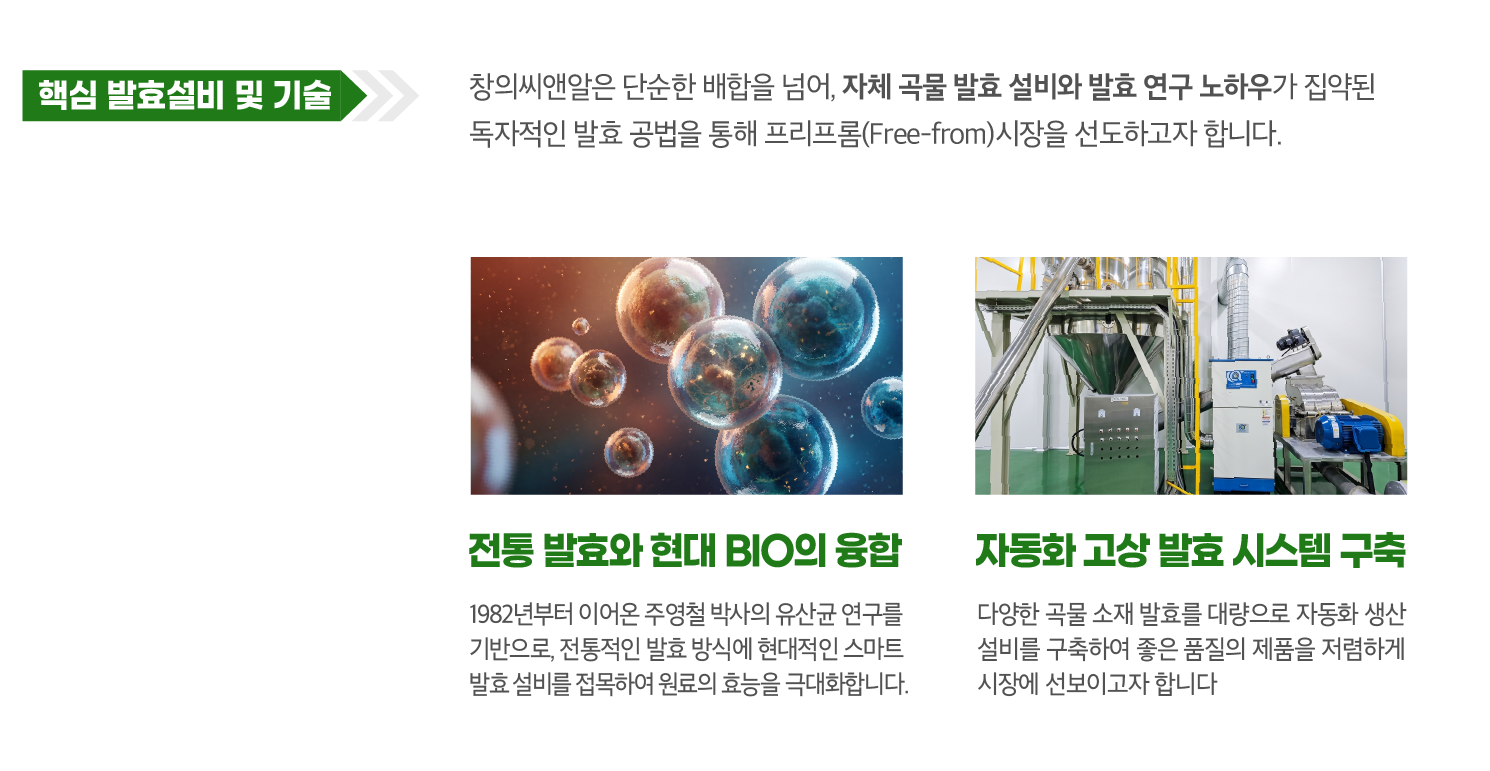 건강한 식문화를 위해 전통 발효와 현대 BIO기술 융합에 힘쓰고 있습니다. 1982년부터 한 길을 걸어온 유산균 박사 주영철과 창의씨앤알 연구원들은 유산균 발효, 곡물 발효, 특허원료로 우리 몸의 세포를 건강하고 활력있게 만들어 나가도록 노력하겠습니다.
